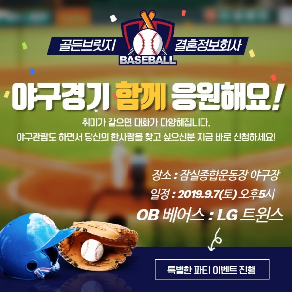 [이벤트종료] 함께 야구경기 응원해요! OB베이스 : LG트윈스 장소 잠실종합운동장 신청기간 2019-08-25 ~ 2019-08-31 행사날짜 정원 남녀 총 20명이내 선착순 위치 서울 잠실종합운동장 야구장 목록 SNS공유 상세정보 함께 야구 관람하며 신나게 응원하면서 당신의 한사람을 찾고 싶으신 분은 지금 바로 신청하세요!대상 : 스포츠 관람을 좋아하는 활동적 성격의 청춘 남녀인원 : 남녀 총 20명이내 선착순신청기간 : 2019년 8월 25일 ~ 8월 31일 참가자격 : 법적 싱글 인증완료 회원문의 : 02) 541 - 5604~5 목록
