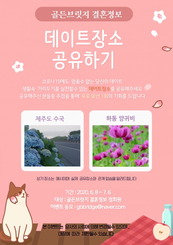 데이트 장소를 공유해 주세요 생활속 거리두기를 실천할 수 있는 데이트장소를 보내주세요. 추첨을 통해 무료맞선 1회의 기회를 드립니다 장소 신청기간 2020-06-08 ~ 2020-07-06 행사날짜 추첨날짜 : 2020. 07. 10 정원 위치 목록 SNS공유 상세정보 데이트 장소 공유하기 이벤트!!코로나19 감염예방을 위한 생활속 거리두기 캠페인을 시행중입니다.생활속 거리두기를 실천할수 있는 사람이 많지 않은 나만의 특별한 데이트장소를 공유해 주세요추첨을 통해 총 3분께 무료맞선 1회의 기회를 드립니다응모기간 : 2020. 6. 8 ~ 7. 6대상 : 골든브릿지 결혼정보 정회원 이벤트 응모 : [email protected]* 당첨자는 개별적으로 연락 예정입니다*본 이벤트는 당사의 사정에 의해 변경되거나 취소될수 있으며, 대상에 따라 제한될 수 있습니다 목록