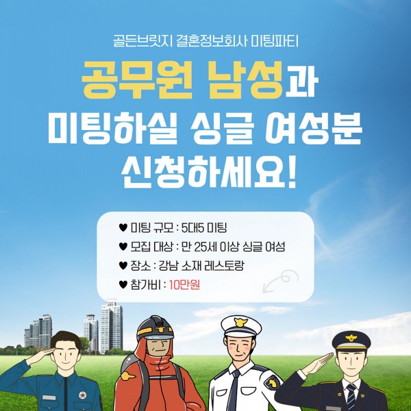 공무원 남성과 미팅파티 5급 공무원 남성과 함께하는 즐거운 미팅파티입니다 장소 강남 소재 레스토랑 신청기간 2021-01-01 ~ 2021-07-31 행사날짜 미정 정원 10명 위치 목록 SNS공유 상세정보 결혼정보회사 Launching 1주년 기념!신뢰할 수 있는 직업군의 싱글남녀가 참여하는5:5 미팅 파티에 여러분을 초대합니다.연령대, 이상형 등을 고려해 모임을 주선해 드립니다.공무원과 미팅파티를 희망하시는 분들은 신청해 주세요^^✔파티명 : 공무원 남성과 함께하는 미팅파티✔미팅규모 : 5대5 ✔모집 대상 : 만25세 이상 싱글여성✔장소 : 강남 소재 레스토랑✔참가비 : 10만원(식대 및 주류비 포함)※ 본 파티는 결혼정보회사의 신원검증시스템에 따라 신원인증이 완료된 분에 한하여 참석 가능합니다.※ 미팅일정이 정해지면 신청자에 한해 안내 연락을 드립니다.(코로나19 상황을 지켜보고 추후 개최 예정)※ 본 파티는 당사 사정에 의해 변경, 취소 될 수 있으며 대상에 따라 제한될 수 있습니다.※ 참여 문의 : 02-541-5064~5 / 카카오톡 ID : 골든브릿지 결혼정보 목록