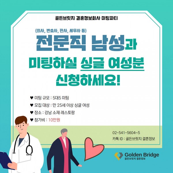전문직 남성과 미팅파티 전문직 남성과 함께하는 즐거운 미팅파티입니다 장소 강남 소재 레스토랑 신청기간 2021-01-01 ~ 2021-07-31 행사날짜 미정 정원 10명 위치 목록 SNS공유 상세정보 결혼정보회사 Launching 1주년 기념!신뢰할 수 있는 직업군의 싱글남녀가 참여하는5:5 미팅 파티에 여러분을 초대합니다.연령대, 이상형 등을 고려해 모임을 주선해 드립니다.의사, 변호사, 판사, 세무사 등 전문직 남성과 미팅파티를 희망하시는 분들은 신청해 주세요^^✔파티명 : 전문직(의사, 변호사, 판사, 세무사 등) 남성과 함께하는 미팅파티✔미팅규모 : 5대5 ✔모집 대상 : 만25세 이상 싱글여성✔장소 : 강남 소재 레스토랑✔참가비 : 10만원(식대 및 주류비 포함)※ 본 파티는 결혼정보회사의 신원검증시스템에 따라 신원인증이 완료된 분에 한하여 참석 가능합니다.※ 미팅일정이 정해지면 신청자에 한해 안내 연락을 드립니다.(코로나19 상황을 지켜보고 추후 개최 예정)※ 본 파티는 당사 사정에 의해 변경, 취소 될 수 있으며 대상에 따라 제한될 수 있습니다.※ 참여 문의 : 02-541-5064~5 / 카카오톡 ID : 골든브릿지 결혼정보 목록