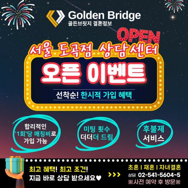 [한시적 가입 혜택] 도곡점 상담센터 오픈기념 Big Event! 다신 없을 기회! 최고 혜택! 최고 조건! 가입 기회를 잡아보세요~! 장소 신청기간 2023-10-24 ~ 2023-11-30 행사날짜 정원 위치 목록 SNS공유 상세정보 <서울 도곡점 상담센터 오픈기념 Big Event>선착순 모집! 한시적 가입 혜택!강남 도곡점 상담센터의 오픈을 기념하며,최고 혜택! 최고 조건!으로 가입 기회를 제공하고 있습니다.★다신 없을 선착순 파격 이벤트★ 꼭 잡아보세요!✔모집 대상 : 4년제 대졸 이상 미혼 남녀 [신청하는 방법]사이트 회원가입(무료) 해주세요. 가입 시 본인의 정보와 이상형 정보까지 꼼꼼하게 작성해 주셔야 합니다.회원가입 바로가기 → https://c11.kr/qme0신청자에게는 신뢰할 수 있는 싱글남녀로연령대, 이상형 등을 고려하여 만남을 주선해 드립니다.전문직, 대기업, 공무원 등 다양한 직업의 이성과인연을 만들고 싶은 분들은 서둘러 신청해 주세요^^※ 신청 문의 : 02-541-5064~5 / 카톡 플친 상담 ID : 골든브릿지 결혼정보※ 카카오톡 플러스친구 [상담 바로가기(클릭)] 목록