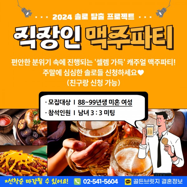 [선착순마감] 설렘 가득 캐주얼 맥주파티 자연스러운 소모임을 통해 인연을 만들어 드립니다. 장소 신청기간 2024-01-27 ~ 2024-03-31 행사날짜 정원 위치 목록 SNS공유 상세정보 다양한 지역과 연령대, 이상형 등을 고려하여소모임을 주선해 드립니다.자연스러운 만남을 통해 인연을 찾고 싶으신 분들은신청해 주세요^^ ✔모집 대상 : 88~99년생 미혼 여성 [신청하는 방법]1. 사이트 회원가입(무료) 해주세요. 가입 시 본인의 정보와 이상형 정보까지 꼼꼼하게 작성해 주셔야 합니다.회원가입 바로가기 → https://c11.kr/qme02. 사이트 가입을 완료하면, 해당 이벤트를 신청해 주시면 됩니다.신청자에게는 신원인증이 완료된 직장인 남성과3:3 미팅 파티를 주선해 드립니다!※ 신청 문의 : 02-541-5064~5 / 카톡 플친 상담 ID : 골든브릿지 결혼정보※ 카카오톡 플러스친구 [상담 바로가기(클릭)] 목록