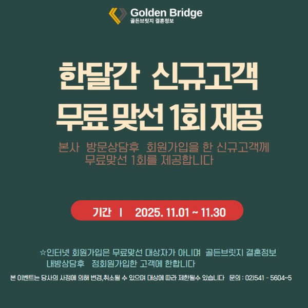 11월 한달간 내방상담후 신규 회원가입한 분들께 추가로 무료맞선 1회를 제공합니다